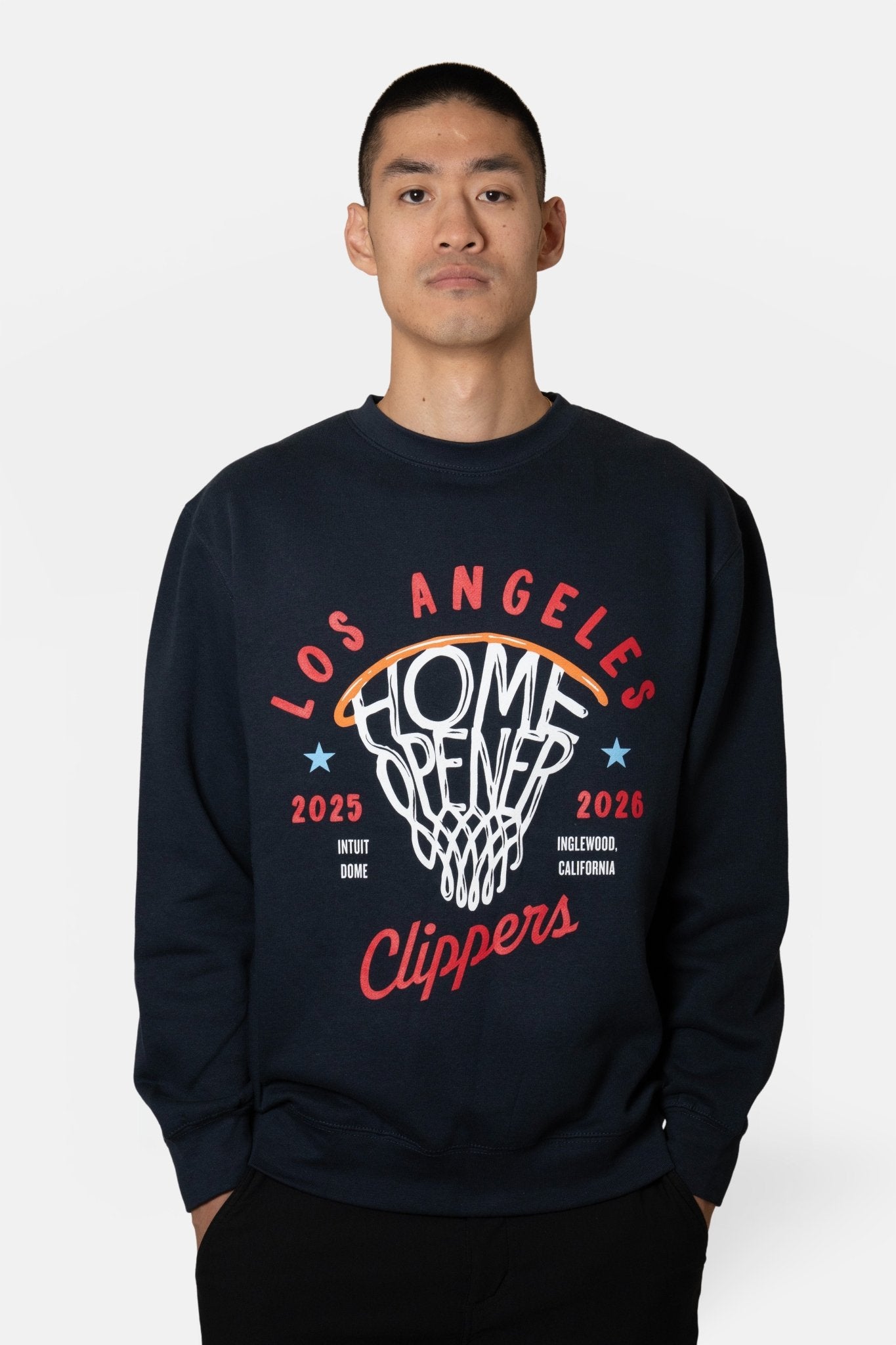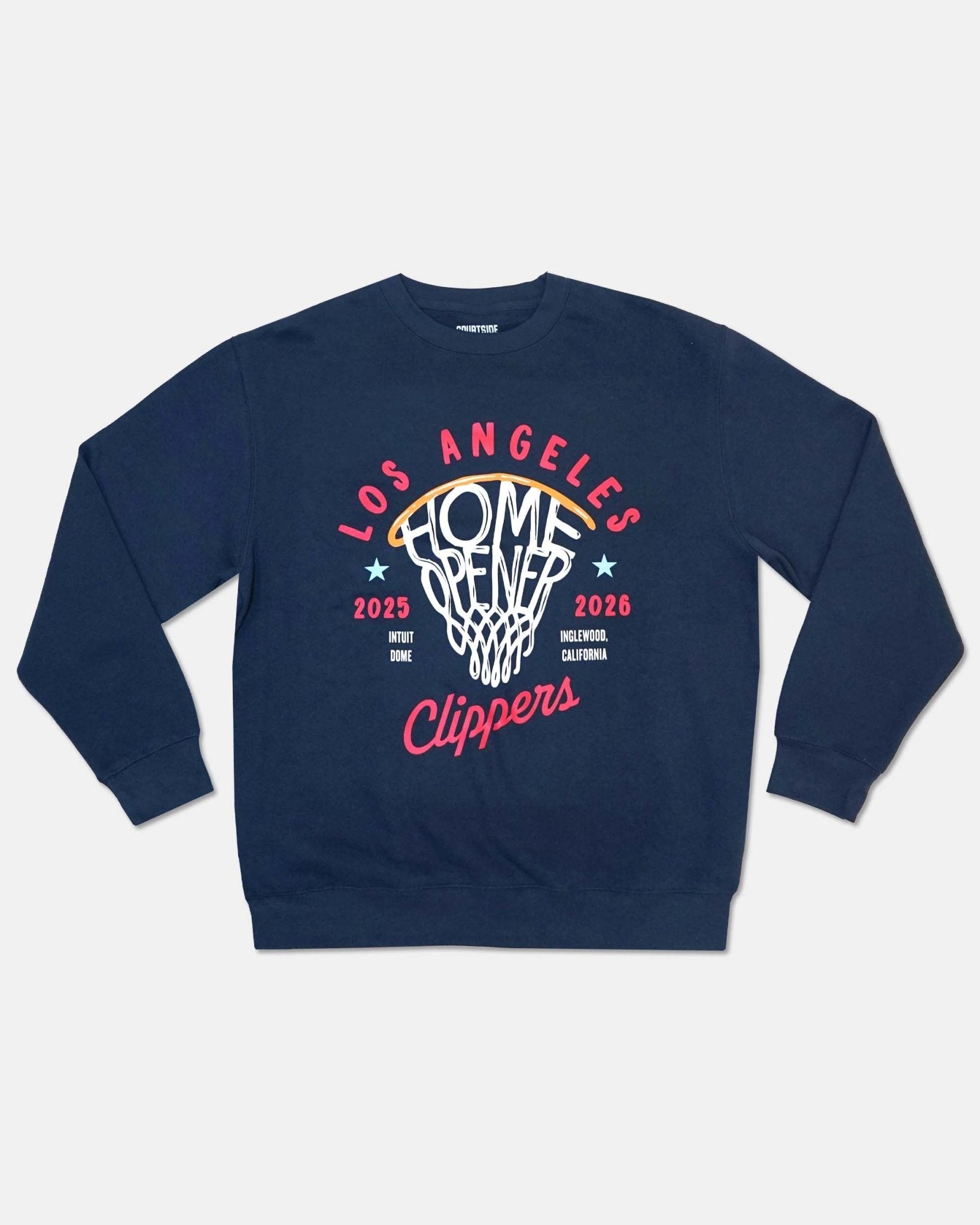 Celebrate the Clippers’ 2025–26 Home Opener at Intuit Dome with this navy crewneck. Featuring bold “Home Opener” graphics and soft fleece fabric, it’s perfect for game day or everyday wear.