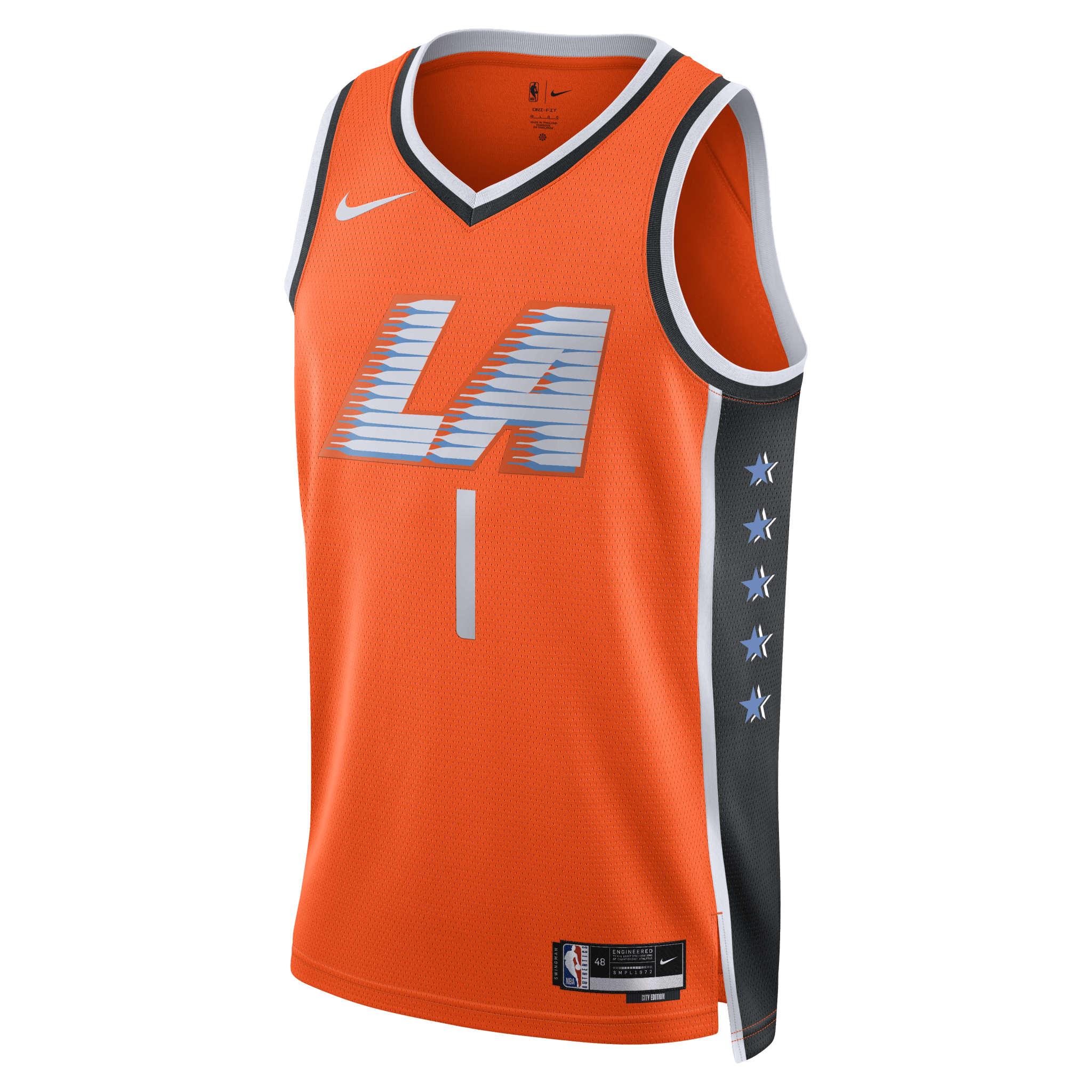The official City Edition jersey of the Los Angeles Clippers. This design features the bold speed-style LA graphic across the chest and star detailing along the side panels, highlighting the energy and identity of the city. Built with breathable, lightweight performance mesh for comfort on and off the court. A statement piece made for fans who rep LA with pride.