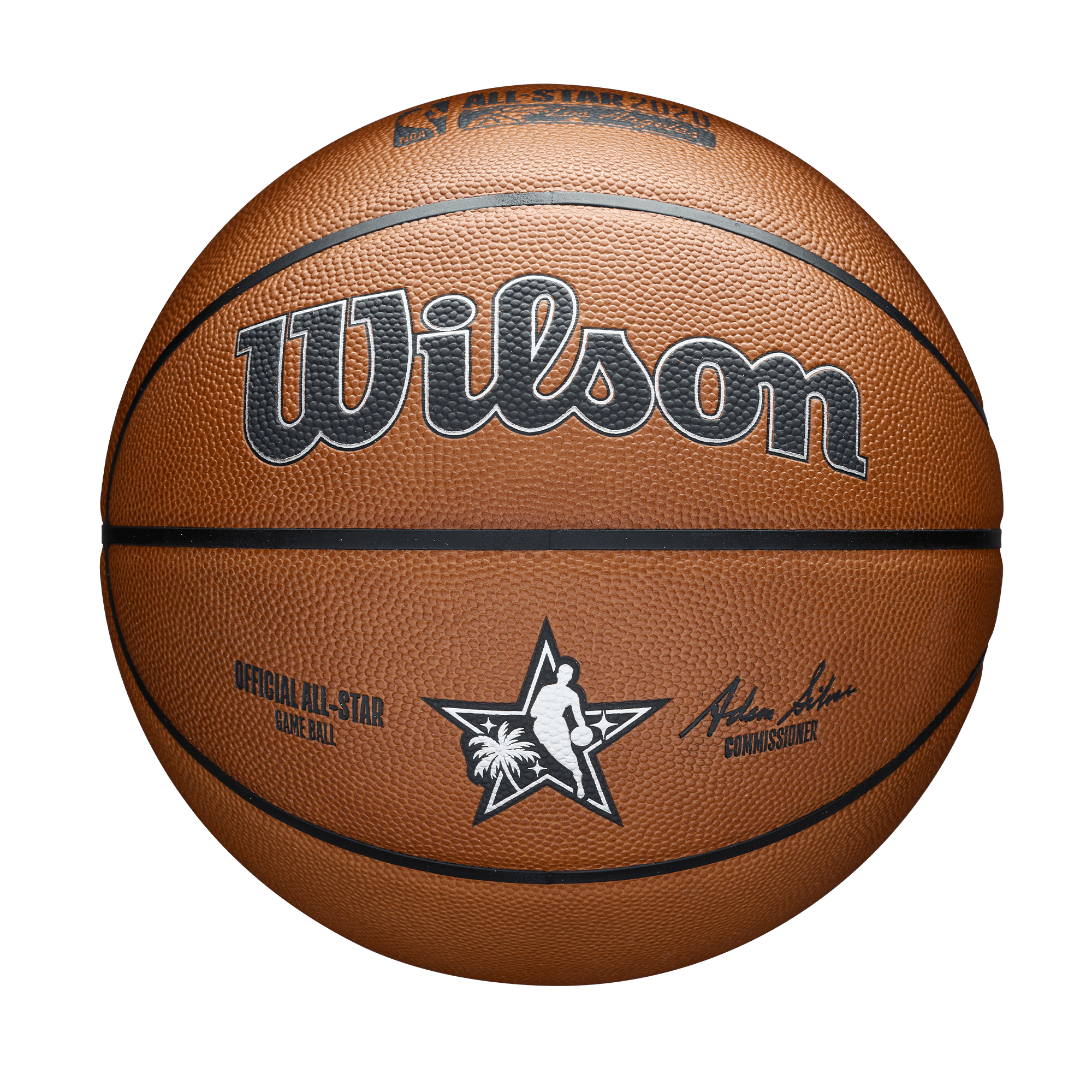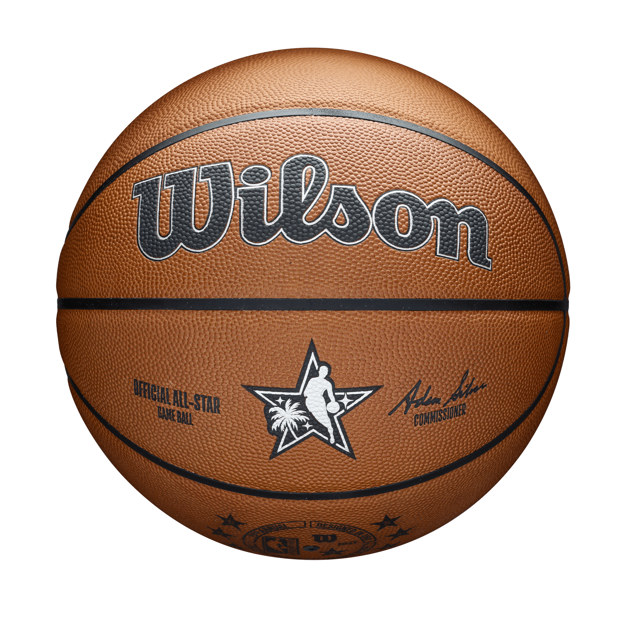 Own a piece of basketball history with the official game ball for the 2026 NBA All-Star Weekend in Los Angeles. Manufactured by Wilson, this ball features a premium pebbled surface with deep black channels for pro-level grip and feel. The design is stamped with exclusive event branding, including the "Star & Palm" silhouette logo on the center panel and the official "NBA All-Star 2026 Los Angeles" wordmark on the upper panel. A special circular stamp near the valve marks this as the "75th Annual" game, sitting alongside Commissioner Adam Silver's signature.