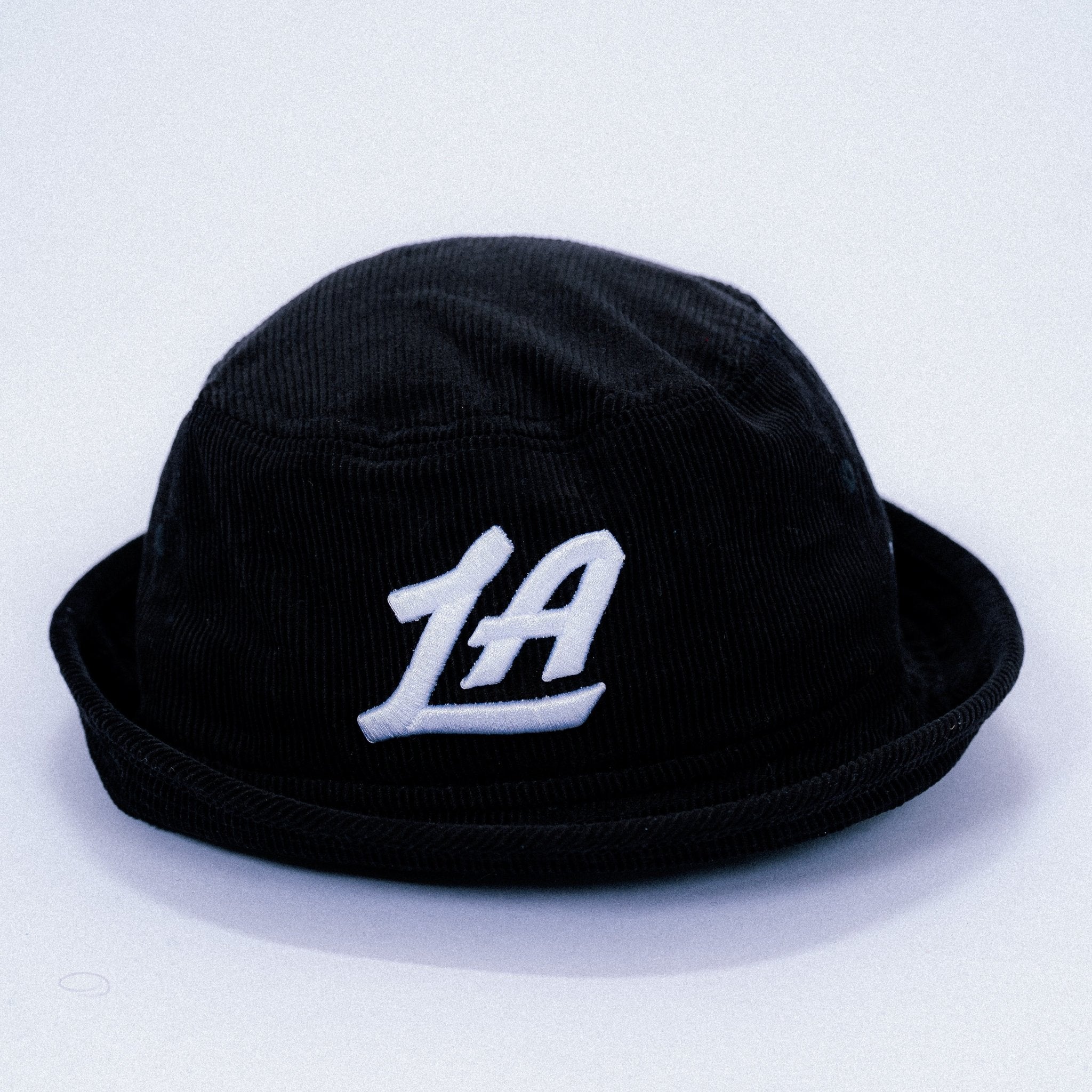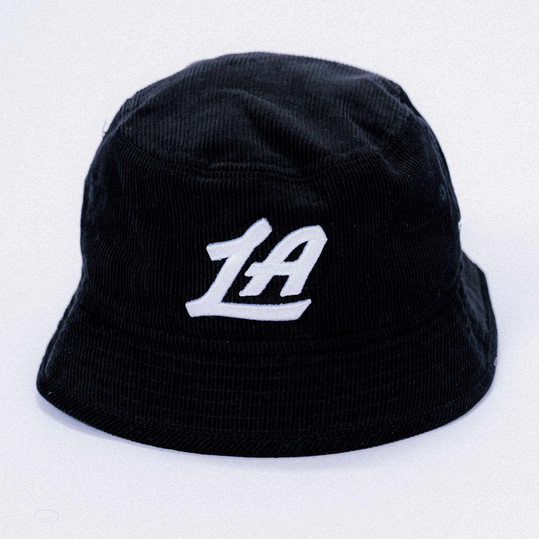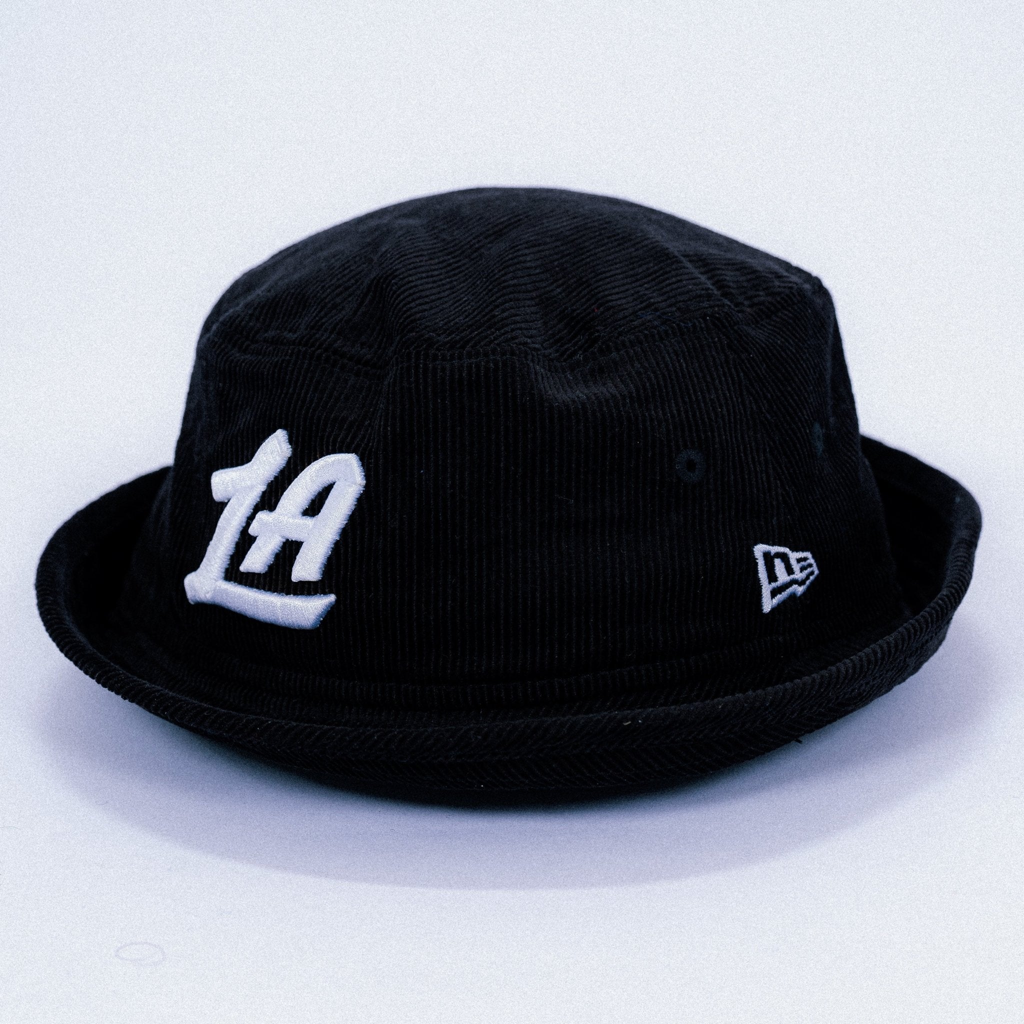 Minimal, timeless, and built for everyday wear. This LA Script Corduroy Bucket Hat features a classic black corduroy body with a raised white embroidered LA script on the front for a clean, understated look. Finished with a subtle New Era flag detail on the side, this piece blends streetwear attitude with premium texture.