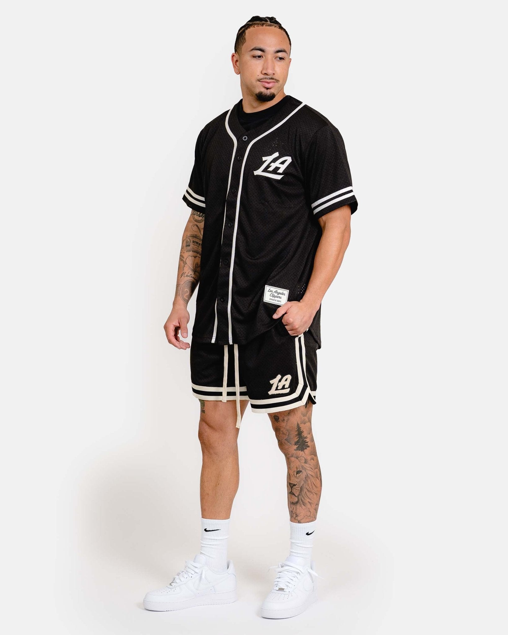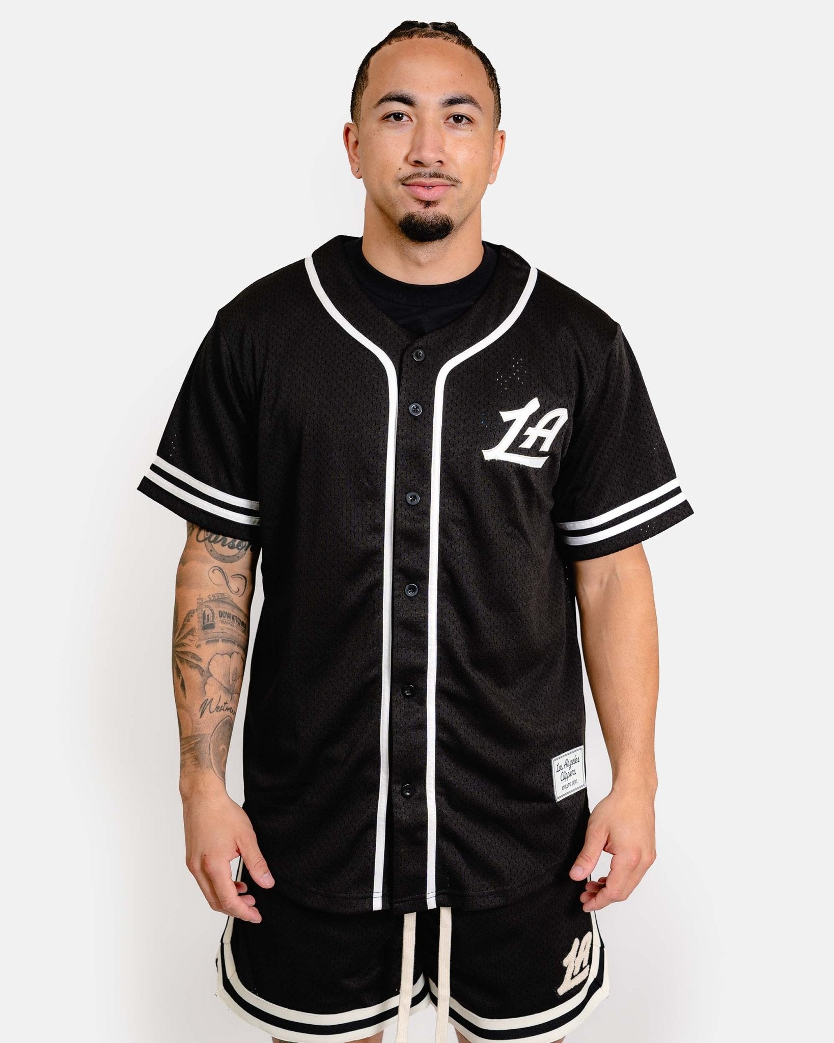 This black LA baseball jersey features a bold “LA” logo on the chest and “Clippers 84” across the back for a throwback-inspired look. Built with breathable mesh fabric and striped trim details, it’s perfect for repping the team in a clean, classic style.