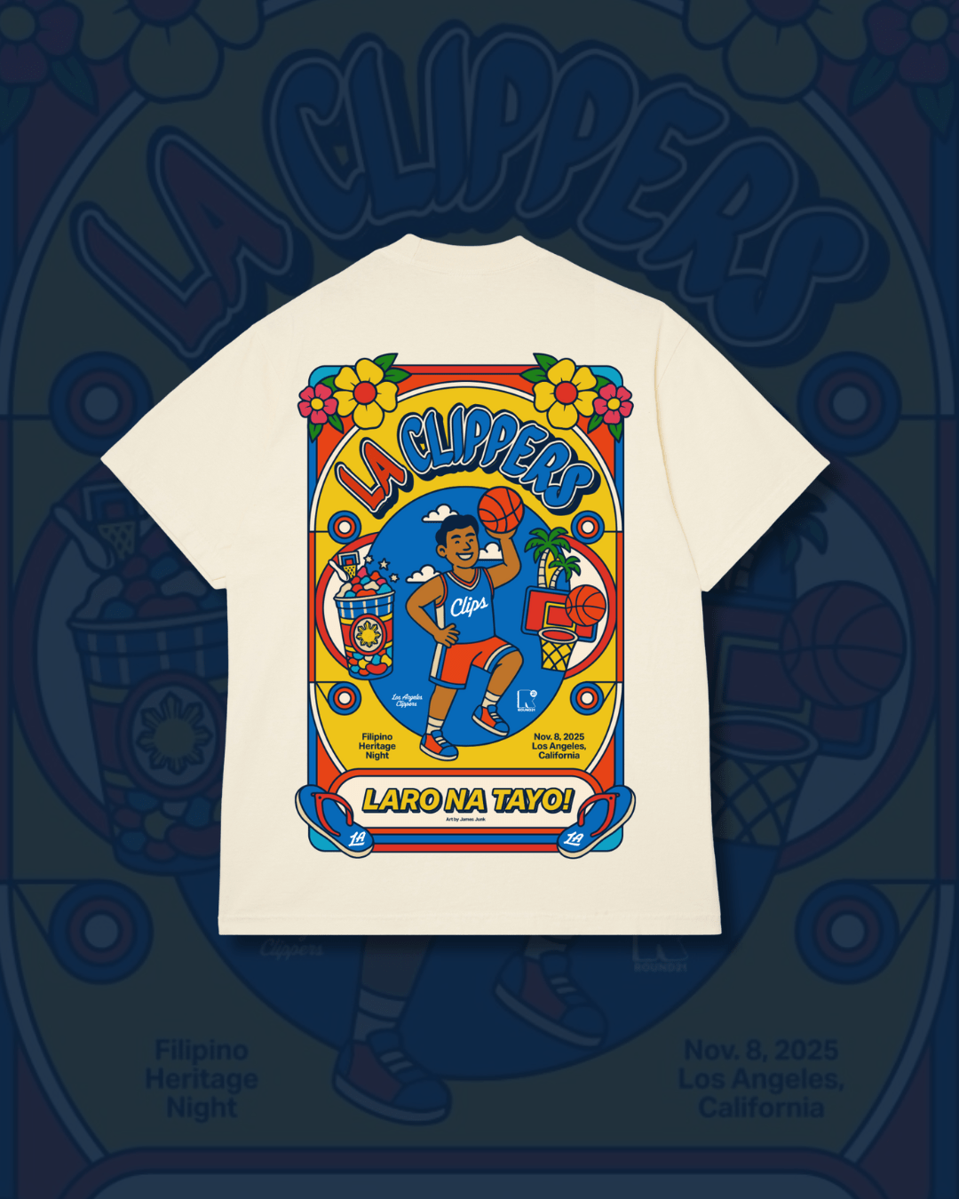 Celebrate Filipino Heritage Night with the Laro Na Tayo! Tee — a special edition piece created for the culture and the Clippers community. Designed in a playful, illustrated style, this tee features vibrant Filipino-inspired colors, imagery, and typography that highlight the joy, pride, and connection between basketball and Filipino culture.