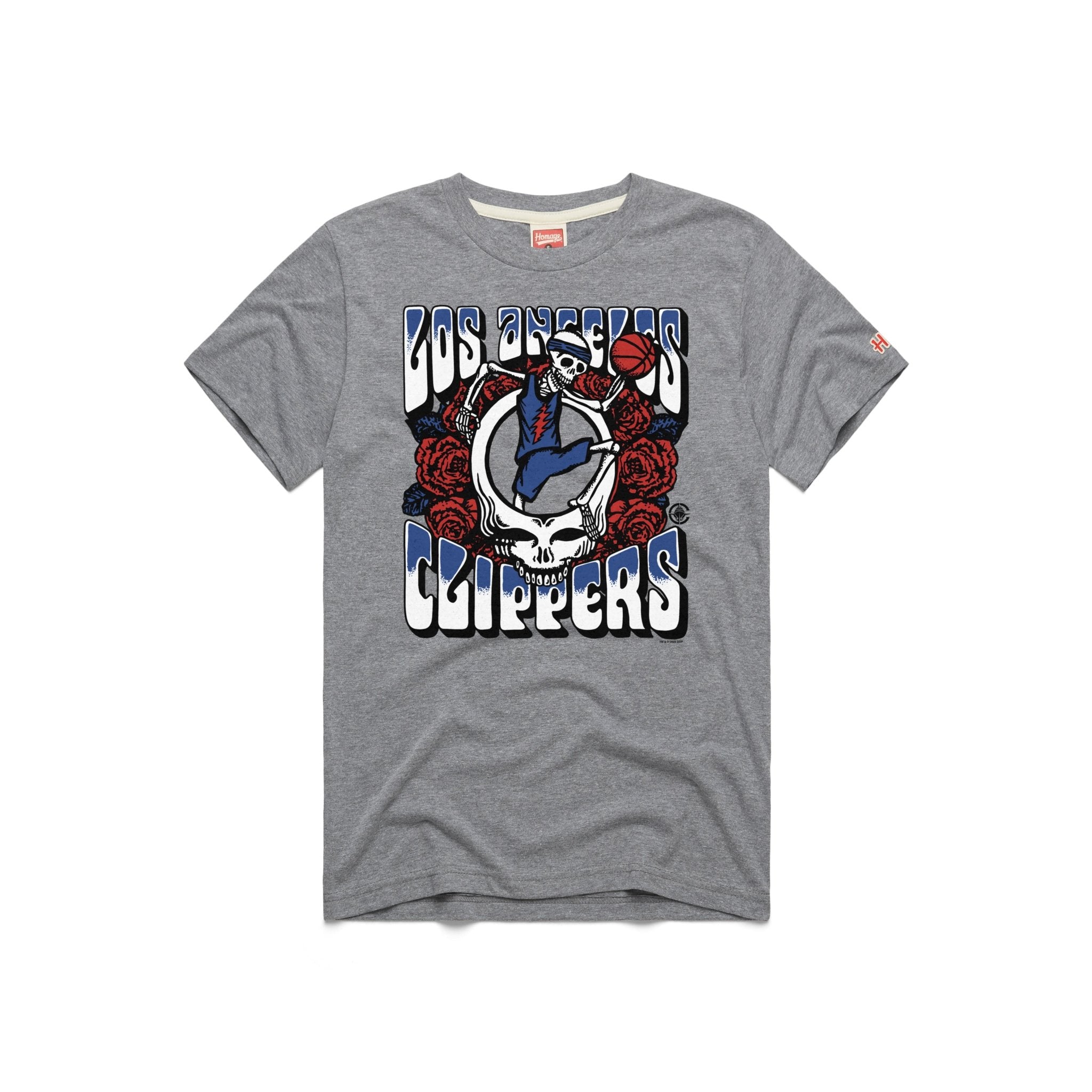 Celebrate two iconic worlds with this Los Angeles Clippers x Grateful Dead Skeleton Graphic Tee. Featuring a bold design that blends the legendary Grateful Dead aesthetic with the Los Angeles Clippers-this shirt showcases a skeleton holding a basketball surrounded by red roses and vibrant team colors. Perfect for fans who love unique, statement-making gear.