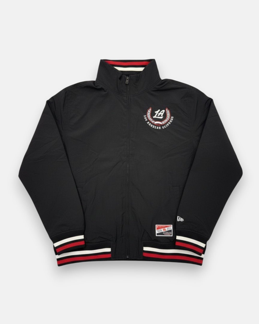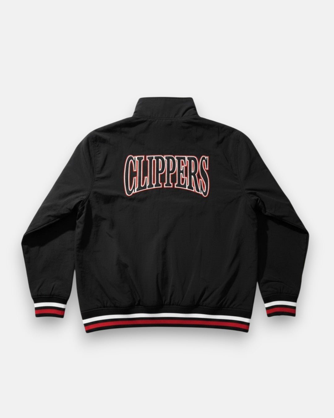 Layer up in classic team style with the LA Clippers Full-Zip Varsity Jacket. This sleek black jacket features bold Clippers lettering across the back and a Los Angeles Clippers crest graphic on the chest for a timeless fan look. Ribbed striped cuffs and hem add a varsity-inspired finish, making it a versatile piece for game days or everyday wear.