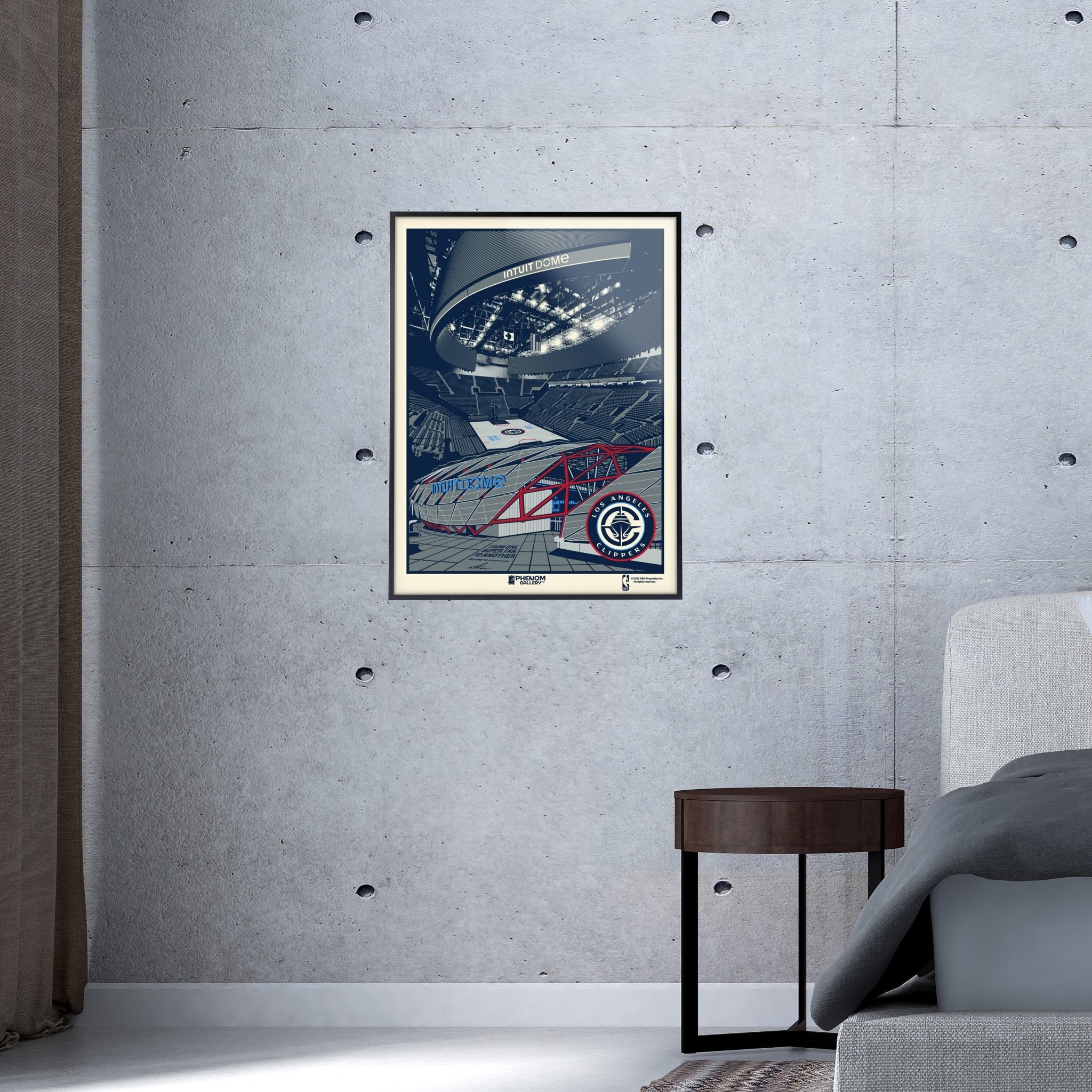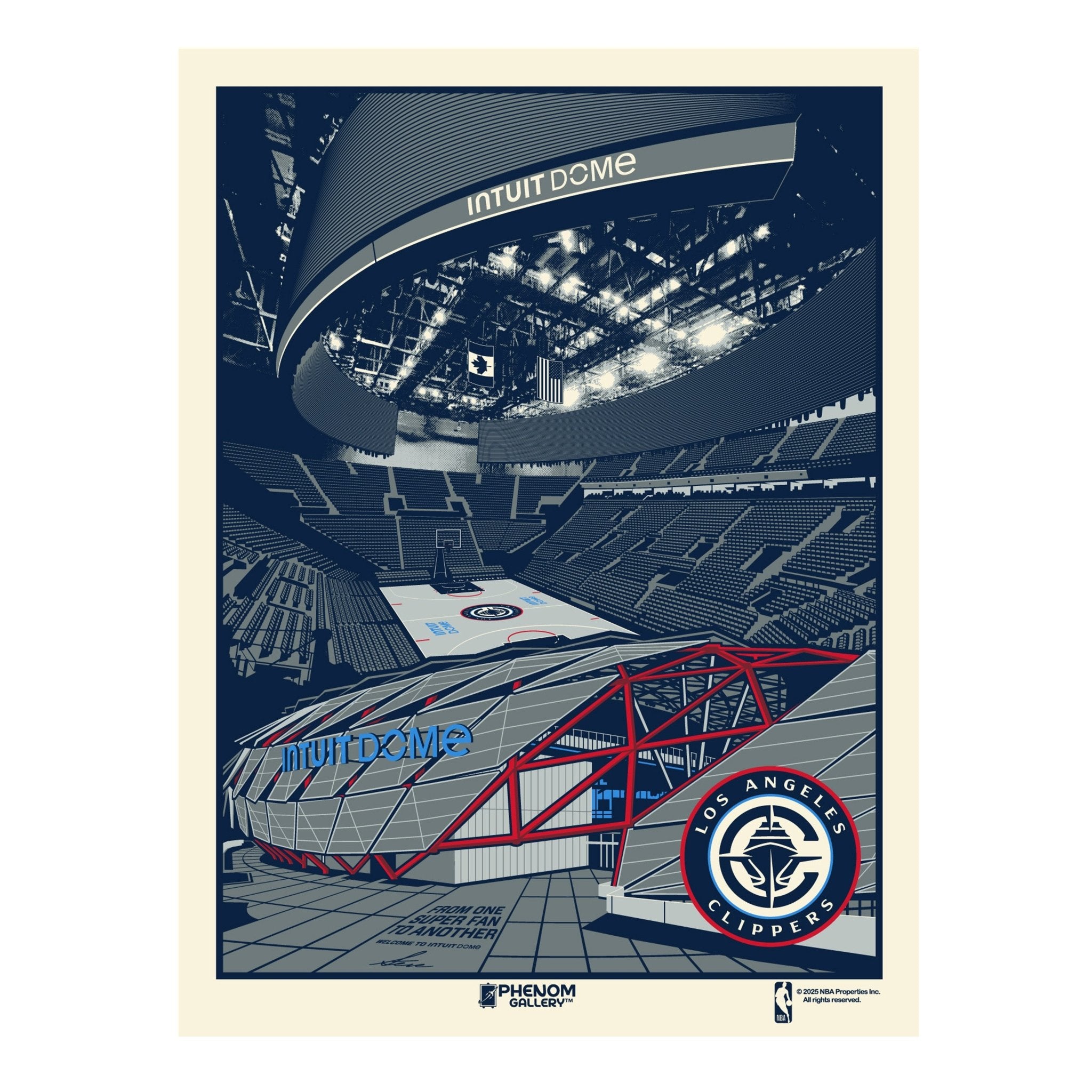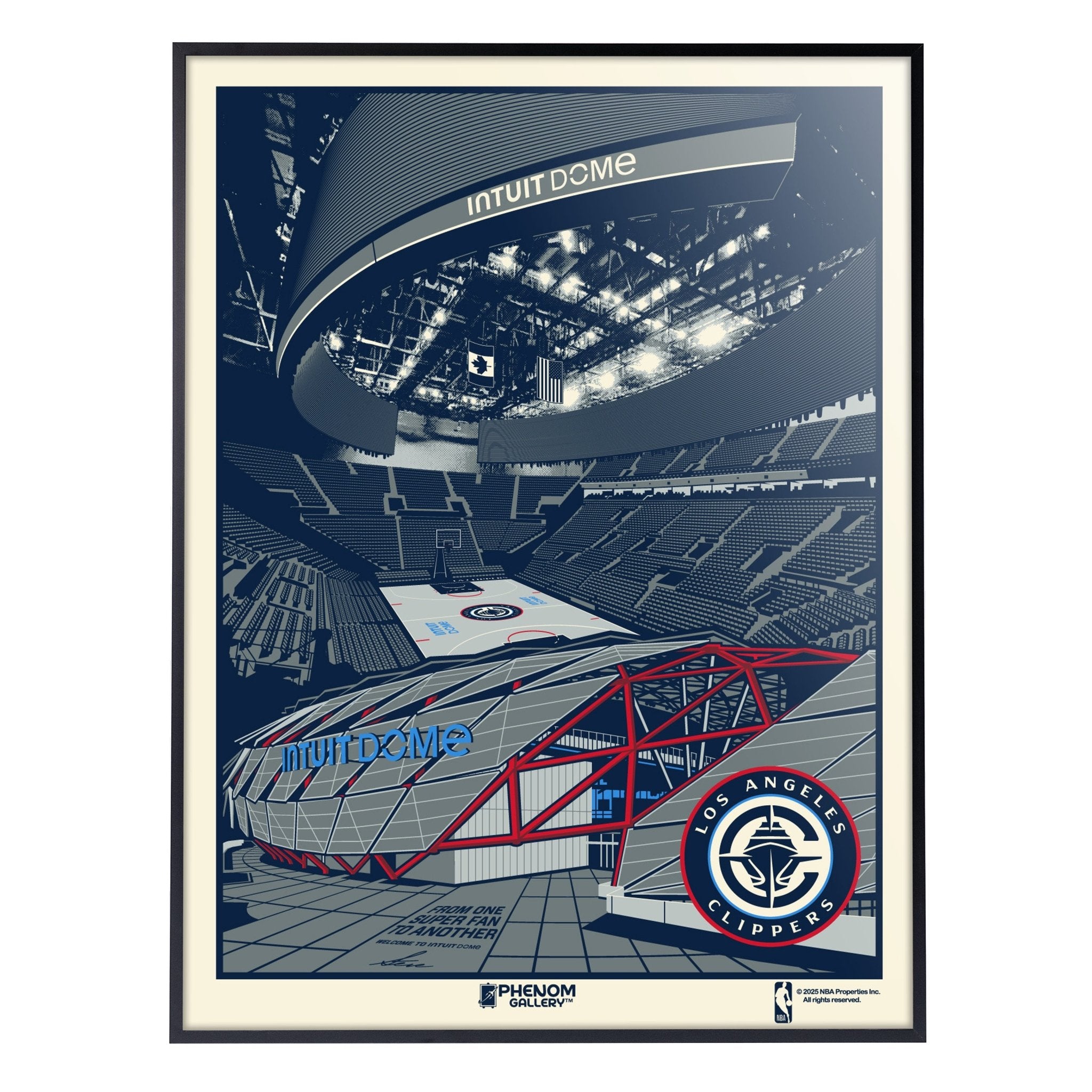 Commemorate a new era of Clippers basketball with this exclusive framed print by Phenom Gallery. The artwork captures the architectural marvel of the team's new home, the Intuit Dome, showcasing a stylized split-view of the iconic exterior grid and the intense interior court atmosphere. Featuring the welcoming slogan "From One Super Fan To Another," this piece is a tribute to the dedicated fanbase that built the franchise. Arriving in a sleek black frame, it’s a gallery-quality statement piece ready to elevate any office, fan cave, or living space.