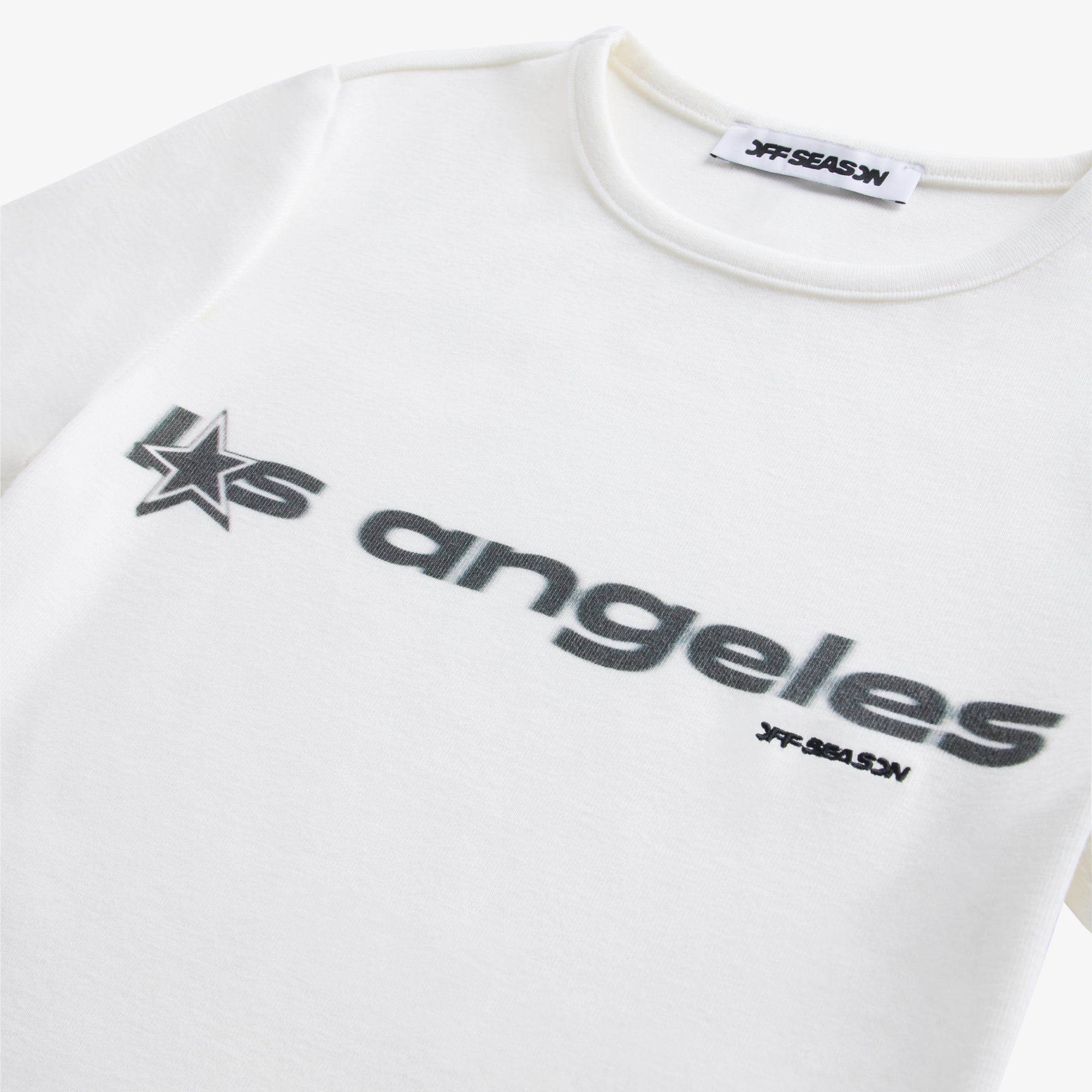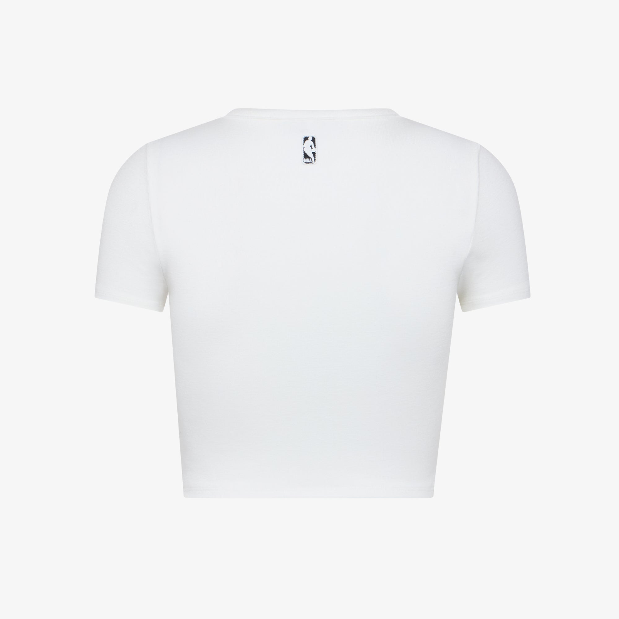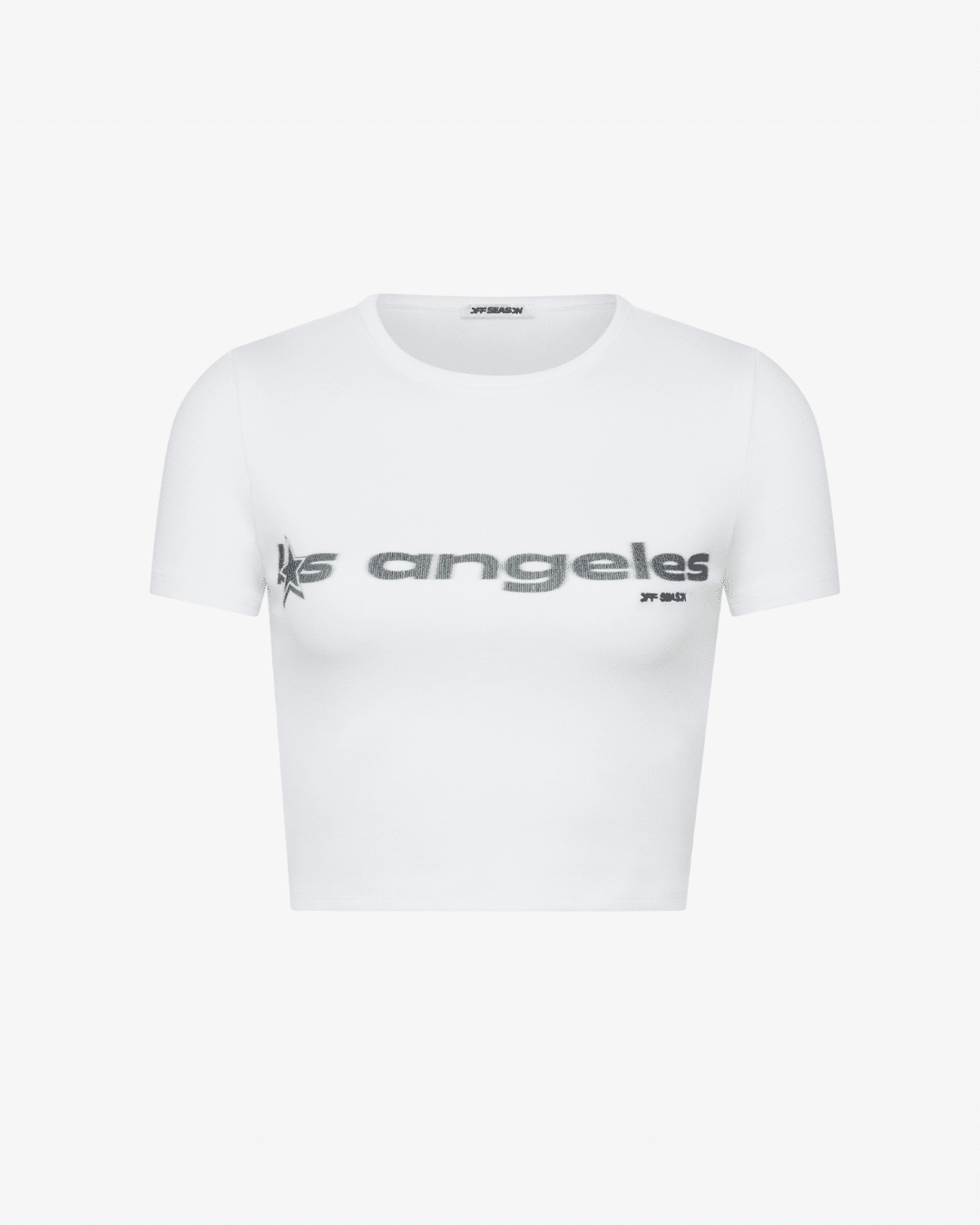 Channel early 2000s energy with this "Baby Tee" silhouette by Off Season. The shirt features a crisp white base that highlights the Y2K-inspired graphic across the chest: "los angeles" written in a lowercase sans-serif font with a distinct motion-blur effect. A stylized star graphic sits to the left of the text, while the Off Season branding is subtly placed below. The back is kept clean and minimal, featuring a small, centered NBA logoman at the neckline. With its cropped length and fitted cut, this tee is a perfect essential for the All-Star festivities.