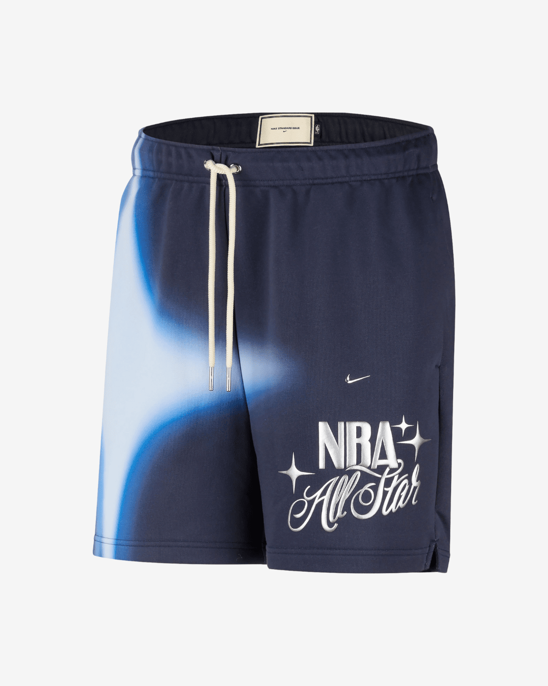 Bring the energy of All-Star Weekend to the court with these statement performance shorts by Nike. The design is dominated by a massive, luminous "starburst" gradient on the left leg, symbolizing the bright lights of Los Angeles. The right leg features the elegant "NBA All-Star" script in metallic silver, accompanied by the classic Nike Swoosh. detailed with a premium cream-colored drawstring with metallic tips, these shorts offer a secure, adjustable fit for game day or casual wear.