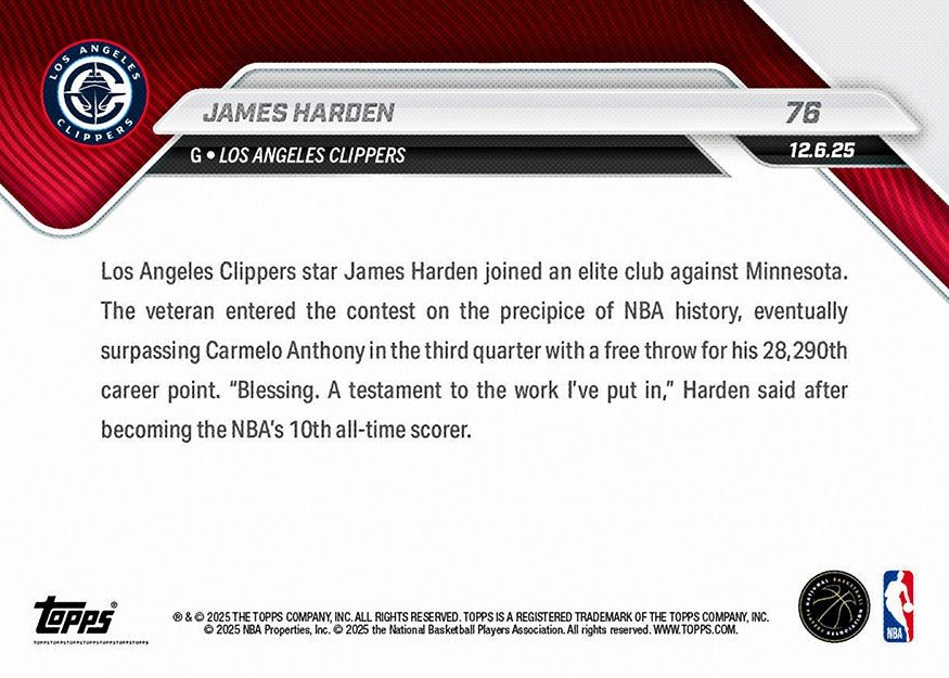 Forever remeber the moment with this Topps Now Card. James Harden joined the elite club against Minnesota. The veteran enter the contest on the precipice of NBA history, surpassing Carmelo Anthony in the 3rd quarted with a free throw for his 28,290th career point. "Blessing. A testament to the work I've put in," Harden said after becoming the NBA's 10th All-Time Score.