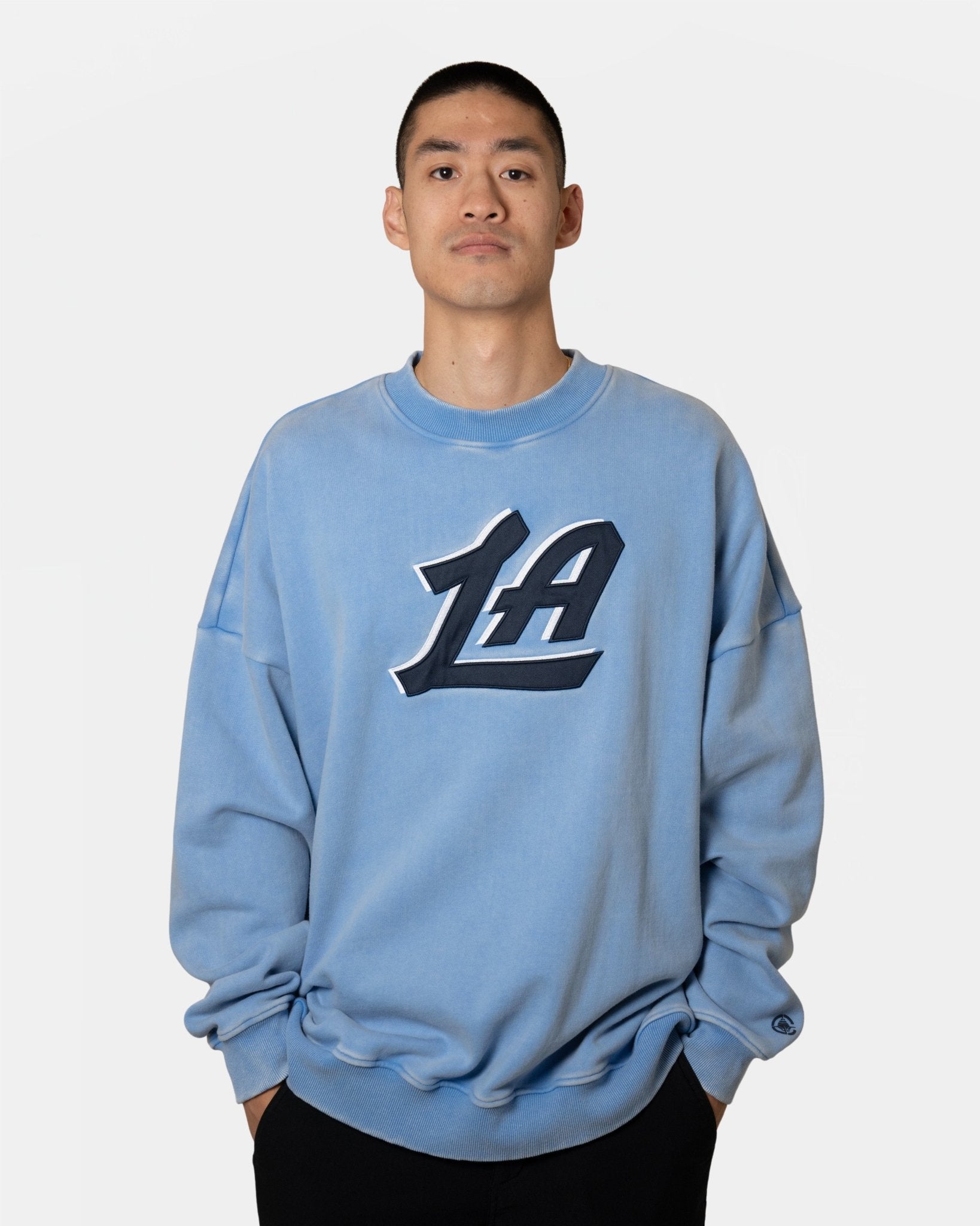 This crewneck brings a clean, vintage-inspired look with a soft, lived-in feel. Featuring a bold LA script logo on the chest and subtle basketball crest hit on the sleeve, it delivers effortless comfort with premium style. The washed blue tone adds a timeless touch—perfect for layering on or off the court.